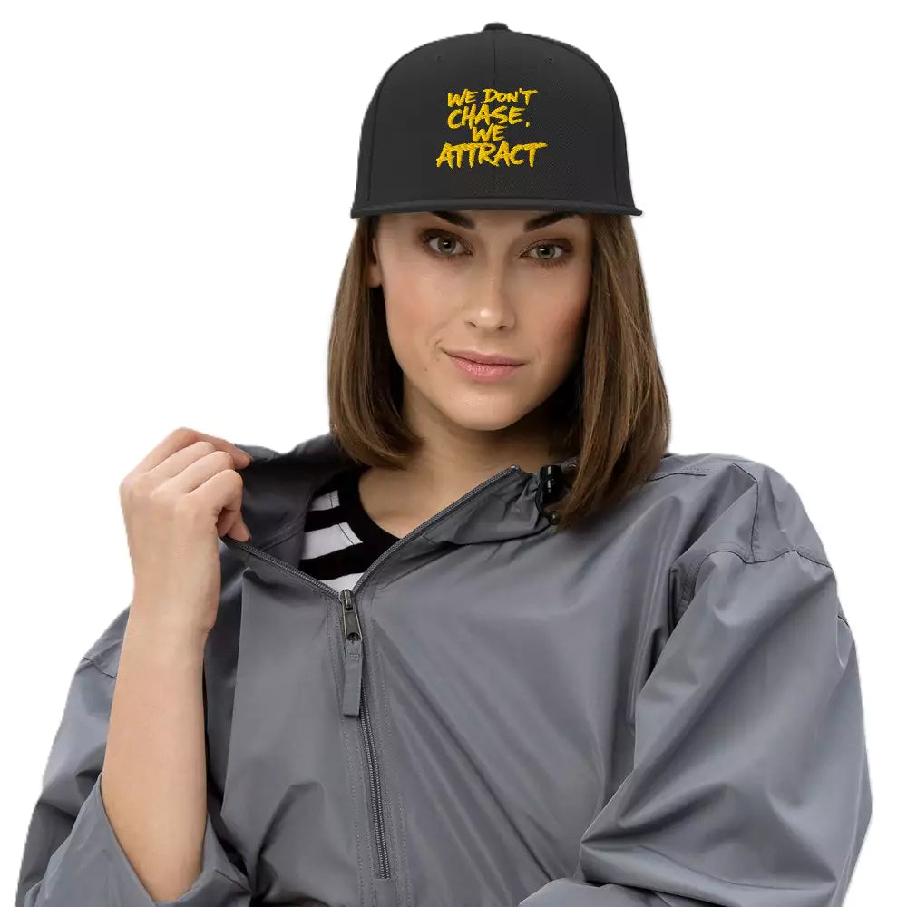 Showcase your philosophy with the striking gold embroidery that reads 'WE DON'T CHASE, WE ATTRACT'. This hat not only looks great but also serves as a constant reminder to attract what you want in life.